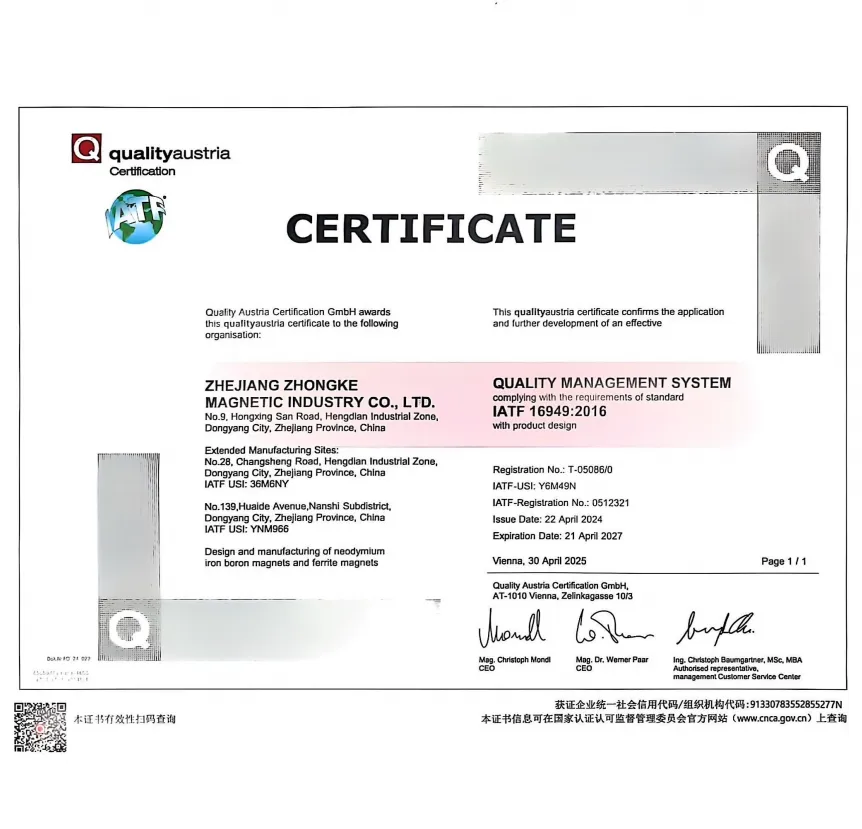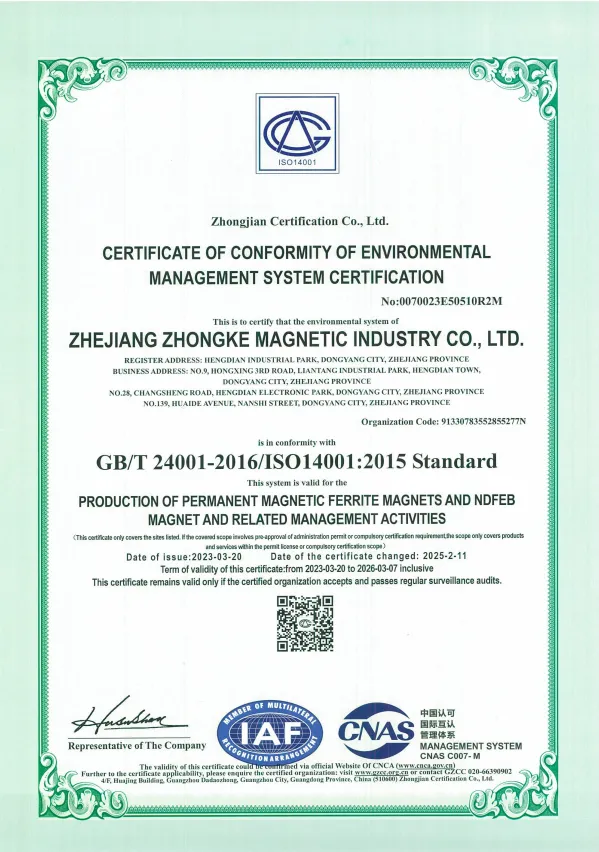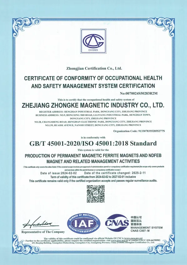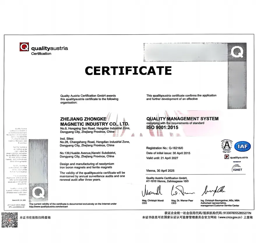 It has two production base Ferrite magnet factory, NdFeB factory which can guarantee the fast delivery and hi-quality. Zhongke has a strict quality system and has already passed ISO14001, ISO9001, TS16949, OHSAS 18001, ISO 45001. All products meet RoHS, REACH and have MSDS Certificate.. Zhongke is a famous Brand in Zhejiang, a provincial high-tech R&D Center and Innovative Demonstration Enterprise in Zhejiang. After many years of preparation, our company have officially launches the IPO and strictly accepted the third-party audit.